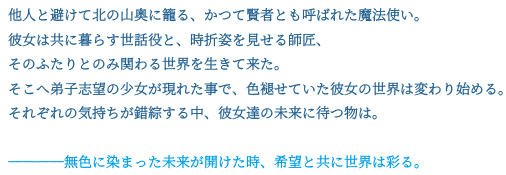 かつて賢者とも呼ばれた魔法使いだが、とある一件をきっかけに北国の山奥で隠居生活をしている。